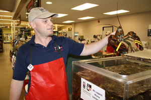 Patrick Hill, Bow Street Market’s meat and seafood manager, plucks a large lobster from the store’s tank. Hill said the store, which gets all of its lobsters locally, is selling about 300 pounds per week.