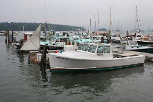 Lobster boats sit at their moorings on the Harraseeket River in Freeport. Falling prices for  lobster have been hurting local fishermen all season.