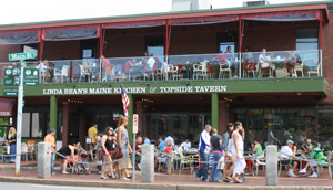 Julia Cafarella, above, of Maynard, Mass., enjoys the playground at the Freeport Seafood Co. this weekend. Beautiful summer weather brought out the lunchtime crowds, right, in Freeport on Saturday.