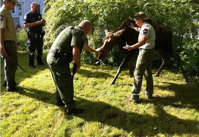 Members of the Westbrook Police Department and the Maine Warden Service tranquilized a moose that had been reported near traffic Wednesday morning. (Photo courtesy of Scarborough Police Department)