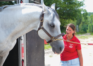 Stephanie Keene, executive director of the farm’s therapeutic riding center, watches as a stallion is unloaded at the facility.