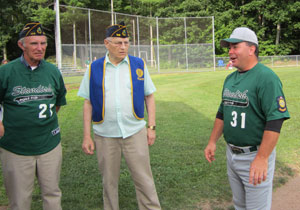 Standish Memorial Post 128 members Lou Stack, left, the commander, and Henry Deschaine, center, talk with Junior Legion coach Max Salevsky at a game in July. With the sponsorship of the Post, Bonny Eagle fielded a Junior Legion team for the first time in six years this summer, and hope to expand to a Senior Legion team next year.