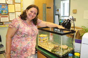 She has company in the office as the school’s mascot, Vinny the turtle, sits on a rock in his tank waiting for the kids to come back.
