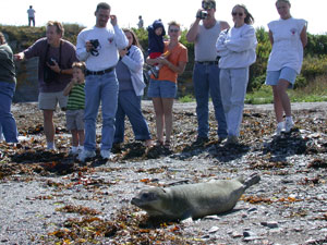 A seal is released into Cape Elizabeth’s Dyer Cove on Sept. 5, 2002.
