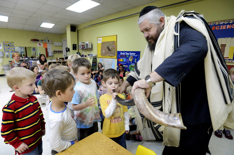 Rabbi Moshe Wilansky helps Noah Stern Rich, 4, blow a shofar, or ram’s horn, as, left to right, Jack Aurritt, 4, Satchel Sonenberg, 3, and Sam Watson 4, watch at the Jewish Community Alliance Preschool in Portland on Thursday. Wilansky, of Portland, was at the preschool to demonstrate the blowing of the shofar to mark the beginning of Rosh Hashana, the Jewish new year, which starts at sundown Sunday. Yom Kippur, the Day of Atonement, begins Tuesday evening.
