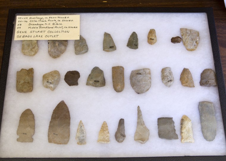 A display case of Native American artifacts collected near the now-flooded outlet of Sebago Lake by Gene Stuart.