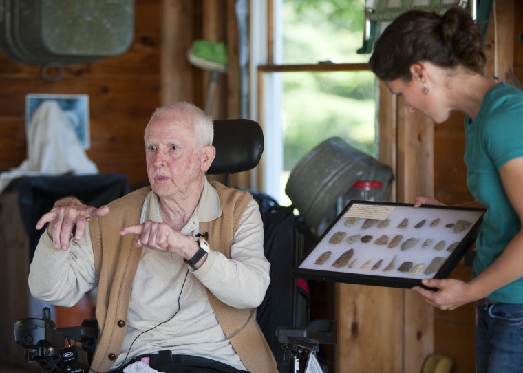 Sarah Plummer, the education coordinator at the Cumberland County Soil and Water Conservation District, listens as Gene Stuart tells the story of his historically significant collection of Native American artifacts. Stuart, a former educator, is now 81 and suffering from ALS, or Lou Gehrig’s Disease. He gathered the stone tools and arrowheads in the area of the Sebago Lake Basin when he was a young man. Photos by Rich Obrey