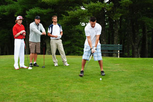 Matt Foye plays the first Jim Foye Memorial Golf Tournament in memory of his father. Looking on are teammates, from left, his brother, Ryan Chute, and friends Christian Hamilton and Travis Rand.