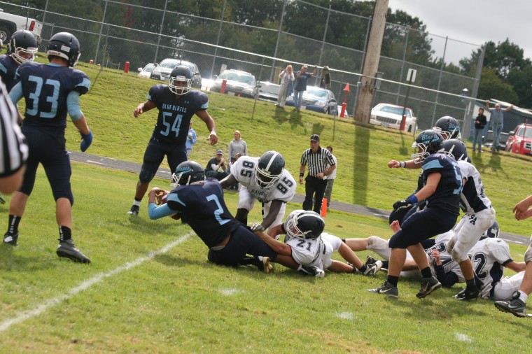 The Blue Blazes started their next series at their 40 and ran the ball eight times right at the Raiders. Bollig carried six times for 43 yards on the drive, which he capped with a 1-yard plunge and two-point conversion score to make it 8-8.
