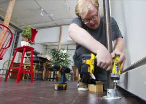 Surrounded by props for the upcoming production of “November,” lighting designer Tom Wyatt drives screws into the flooring that will secure the lighting support system for the play.