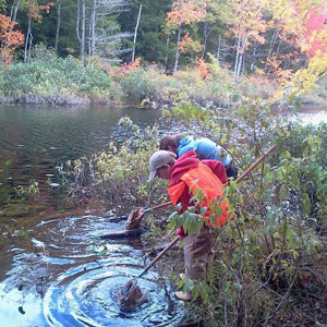 Sawyer LaBarge of Mrs. Fox’s fourth-grade class at Stevens Brook School fishes for aquatic bugs at Holt Pond, with Sarah Morris of Lakes Environmental Association leading the environmental field trip.