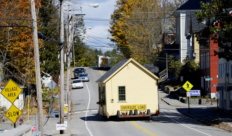The South Windham Library is moved through the village area Thursday on its way from Gorham to the Windham Historical Society. The building was about to be demolished because of a lack of patrons when the society stepped in to take it for use as part of a “living history” park.Â