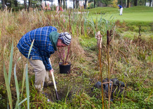 Noah MacVane, a groundskeeper at Sable Oaks Golf Club in South Portland, works around the 13th green on Monday, planting a red twigged dogwood tree in a marshy area along the banks of Long Creek. The golf club was honored this week for its work in helping to protect the Long Creek watershed.
