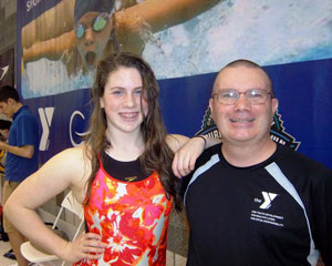 Dan St. Pierre stands with swimmer Abby Belisle Haley at the 2012 YMCA Short Course National Championship meet in Greensboro, N.C., last April. Belisle Haley, a junior at Yarmouth High School, is one of many swimmers St. Pierre has brought to the YMCA nationals in his 10 years as head coach of the Casco Bay Stripers swim team.