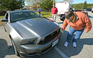 Mike Stavros of Freeport polishes the bumper of his new 2012 Ford Mustang 5.0 as Circle K Market Manager for the Freeport area Jeff Hanning walks over to admire the car and formally present it to Stavros on Oct. 18. Stavros, who works at L.L. Bean, won the car through a national Circle K promotion. He received a code on a fountain soda cup this summer, and texted that code to the company and was the lone national winner of a Mustang. Stavros said he plans to give the car to his daughter, who is currently in college.
