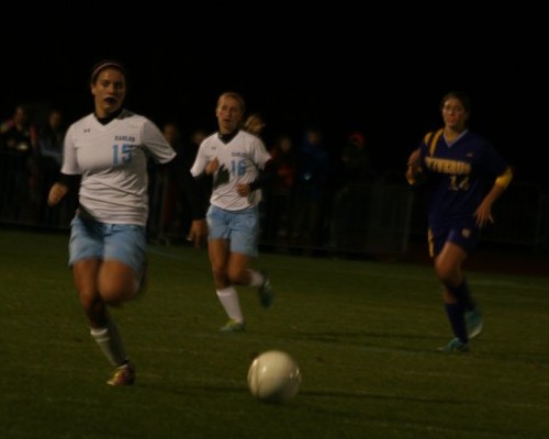 But the Eagles’ ears were now up, and unlike in the first half they were finding space to play in down the Cheverus wings. The pressure paid off 15 minutes into the half when Cassie Symonds won a free kick near midfield. Shoemaker took the kick quickly, catching the Stags defense off-guard, and found Soucy just outside the box, who chipped over the Cheverus defense for an onrushing Jordan Symonds.