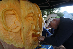 Moe Auger, an employee of L.L. Bean’s Outdoor Discovery School, carves a giant pumpkin Saturday at the Camp Sunshine Pumpkin Festival at L.L. Bean in Freeport. Auger said the pumpkin he was carving weighed in at an impressive 750 pounds. About 10,000 carved pumpkins were on display as part of the festival, which benefited Camp Sunshine in Casco.