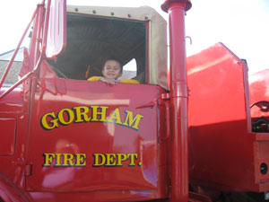 Carson Southyvongnorath, 4, peers out from the cab of Gorham’s huge forest firefighting truck during the open house Saturday at Gorham Public Safety. He attended the open house with Eric Winsor of Gorham Fire Department.