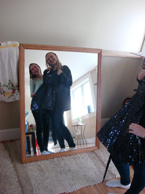 Cape Elizabeth High School juniors Zoë Gillies, left in mirror, and Mackenzie Leighton, compare some of the outfits available from their new nonprofit, Cape Closet, founded to provide dresses to their peers who may lack the means to attend prom night.