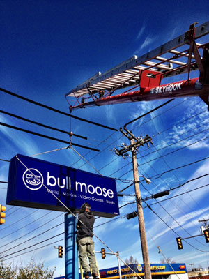 The sign went up last Thursday at the new Bull Moose Mill Creek store in the former Blockbuster building. The South Portland location will hold its grand opening celebration Sunday, Nov. 18. At 11 a.m. that day, Rob Schreiber’s Standard Issue will play with the SoPo High jazz all-stars, with $2 of each CD sold benefiting the South Portland Music Boosters.