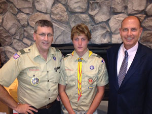 Freeport’s Travis Libsack, center, recently achieved the rank of Eagle Scout. He is flanked by Patrick Zroika, his project coach, left, and Peter Ventre, a representative of the Boy Scouts of America’s Pine Tree Council.