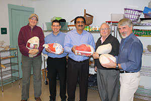 Sue Mack, the family services coordinator for Freeport Community Services, left, and Bob Lyman, Freeport Community Services executive director, far right, receive the first of a donation of 80 turkeys from Freeport Rotarians, from left, James Hendricks, Ranjit Gill and Tom Wilbur on Nov. 15.