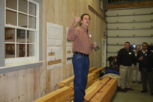 Local businesspeople, from left, James Herling of Durham’s Riverbend Landscaping, Ben Love of Taggart Construction and Dwight Herdrick of Houses and Barns by John Libby, talk during a Greater Freeport Chamber of Commerce Business After Hours event.