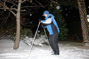 David Pinkham of Leesburg, Va., took advantage of the Dec. 27 snowstorm to try out his cross-country skis in Discovery Park on the L.L. Bean campus. Pinkham, who was staying at the nearby Harraseeket Inn with his wife Lisa, strapped on his skis and circled the park while waiting for the hourly L.L. Bean Christmas tree light show.