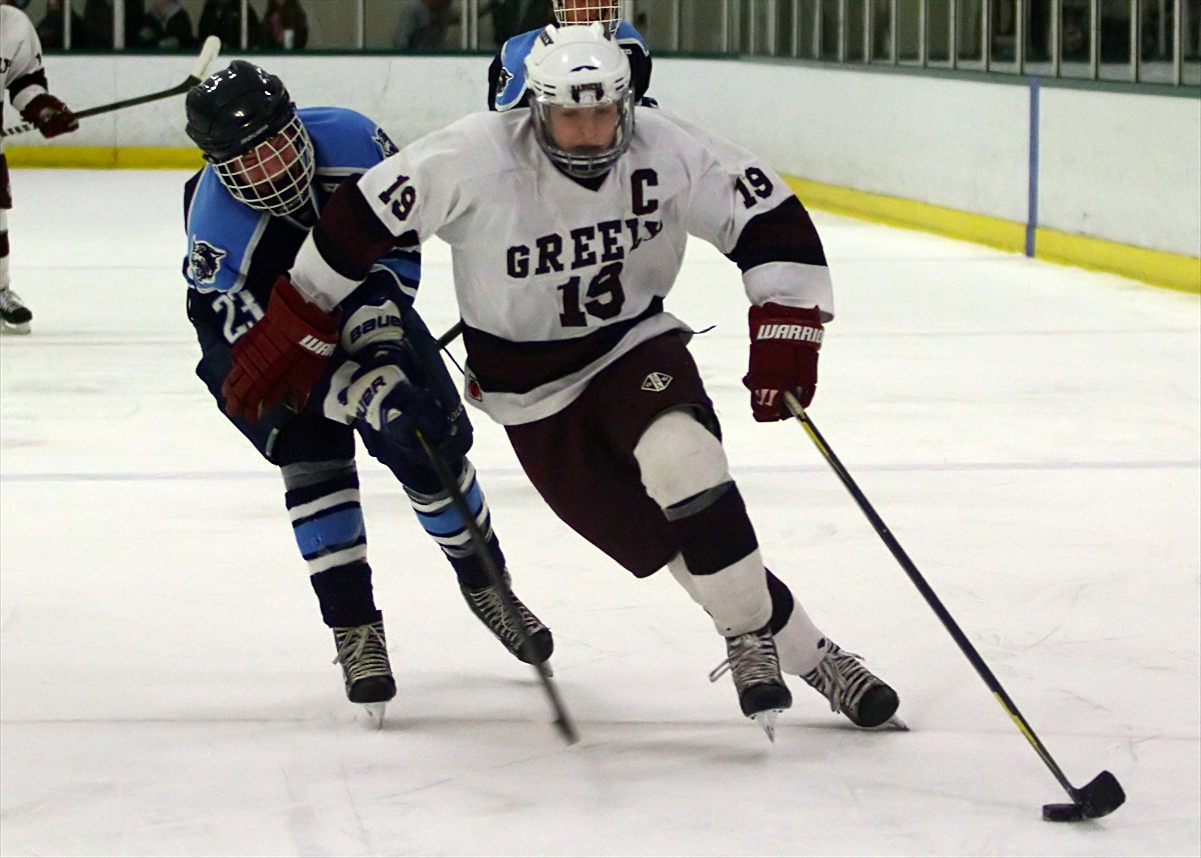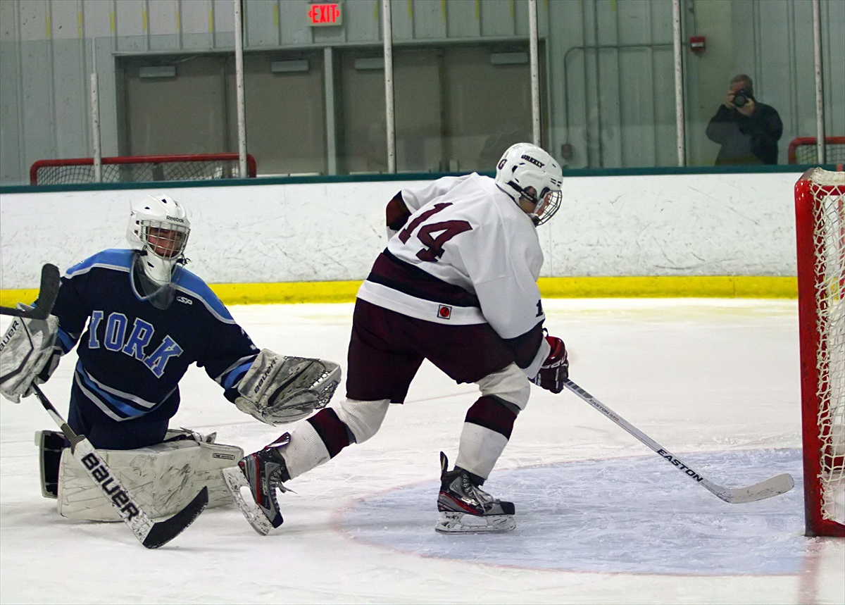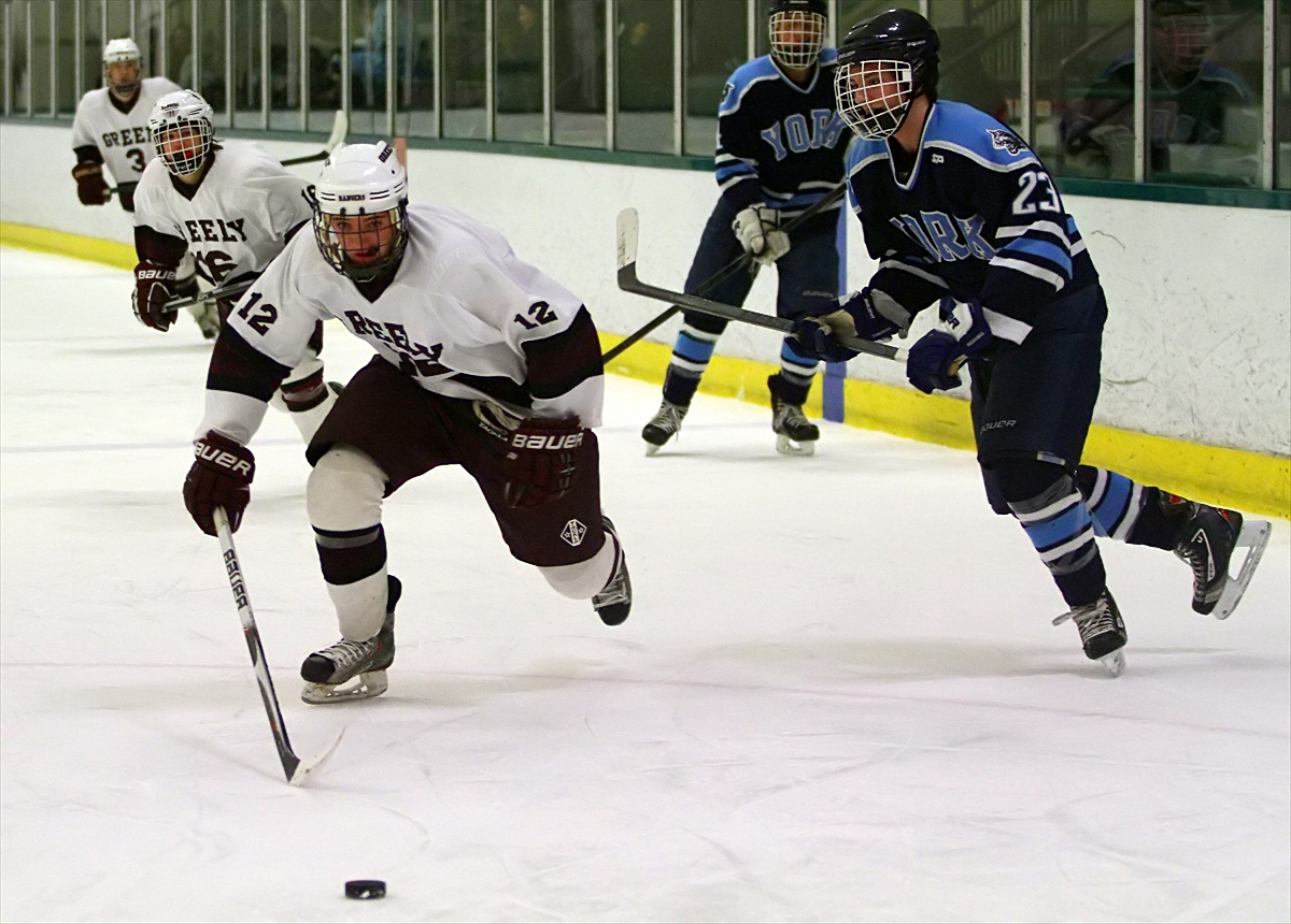 Greely senior captain Kyle Megathlin tries to play the puck past York sophomore defender Nick Walsh.
