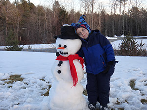 Lucas Lane, 4, hugs the first snowman he has made at his new home in Gorham. He is the son of Ryan and Cindy Lane. Lucas is grandson of American Journal cartoonist Dale Leroux.