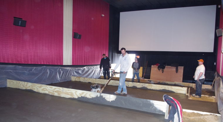Workers level newly installed concrete flooring in one of the seven screens in the former Five-Star Cinema at the Windham Mall. Smitty’s Cinema, once located next to the North Windham Post Office, has leased the space and is upgrading the facility for an expected April opening. Staff photo by John Balentine