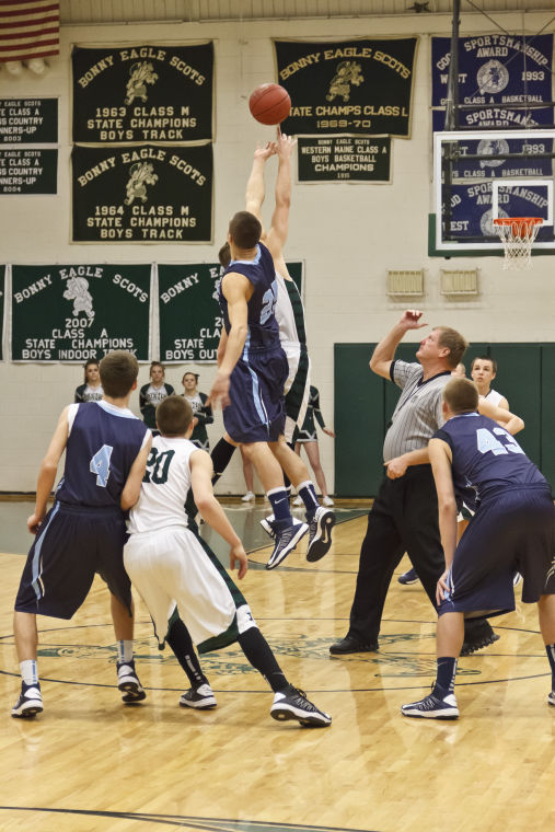 Opening tip-off at the Bonny Eagle-Westbrook game Tuesday night.