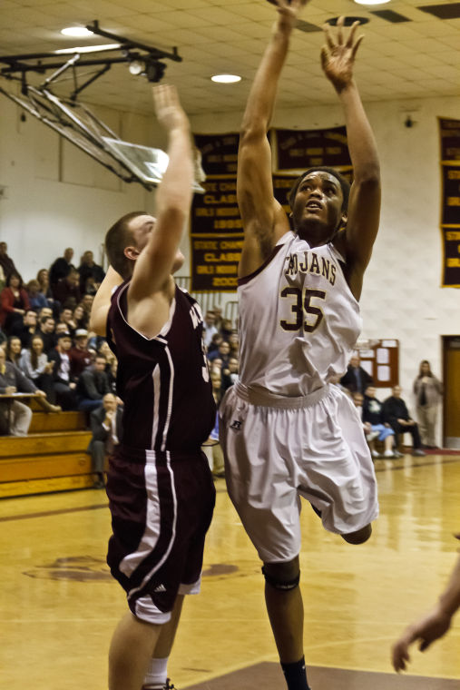 Trojan Quinn Richardson-Newton shoves aside a Windham defender during an ascent toward the basket Tuesday night. Richardson-Newton had 15 in Thornton’s victory.
