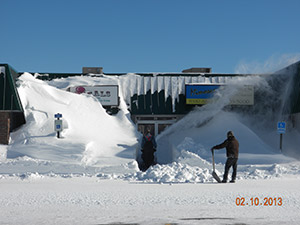 Two workers clear a snow drift from in front of Beal’s Ice Cream in Oak Hill in Scarborough on Sunday. The area was hit by a record-breaking snowstorm Friday into Saturday, with 31.9 inches reported in Portland and 35.5 inches in Gorham.