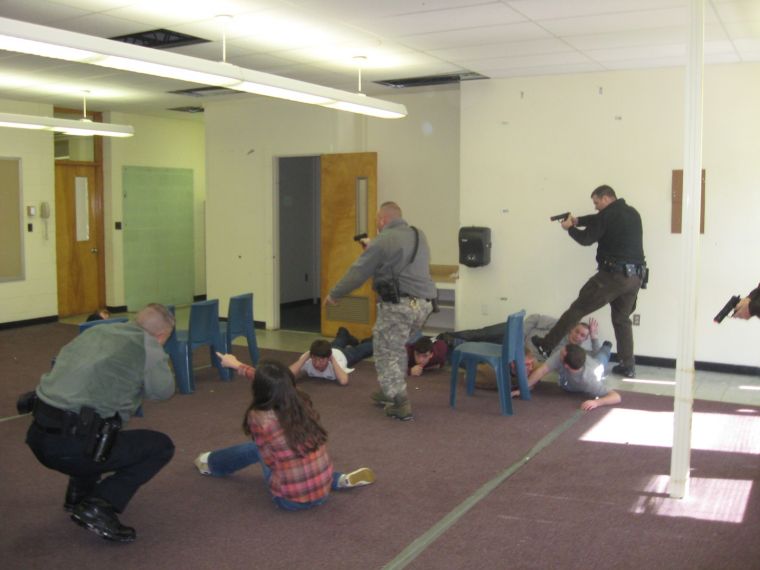 Guns drawn, officers Monday burst into an old Gorham school after an alarm triggered, shots rang out, bodies of students were strewn in rooms and halls, spent ammo shells littered the floor, and students screamed.