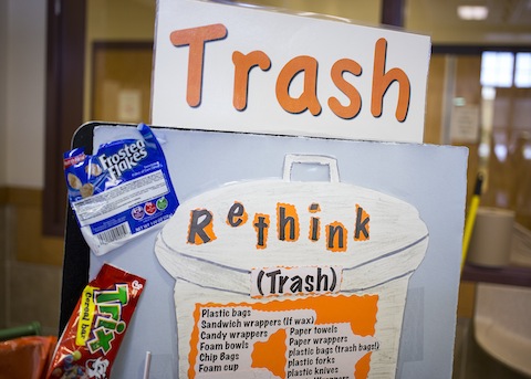 Student volunteers are used each lunch period to direct those finished with their meal to dump their trash, food, liquids, recyclables and reusables into specifically labeled bins. Already, the students say many don’t need help anymore. They just get it.