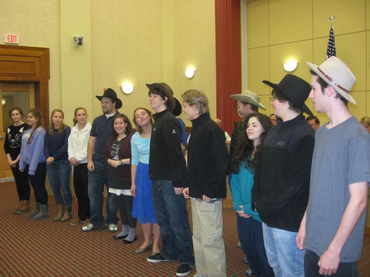 Cast members of the Gorham High School production of the musical “Oklahoma” sing last week for the Gorham School Committee. Performances this weekend are at 7:30 p.m. on Friday, March 22, and Saturday, March 23; and 2:30 p.m. on Sunday, March 24. Tickets are $10; $6, students and seniors. For reservations, call 839-5754. Staff photo by Robert Lowell