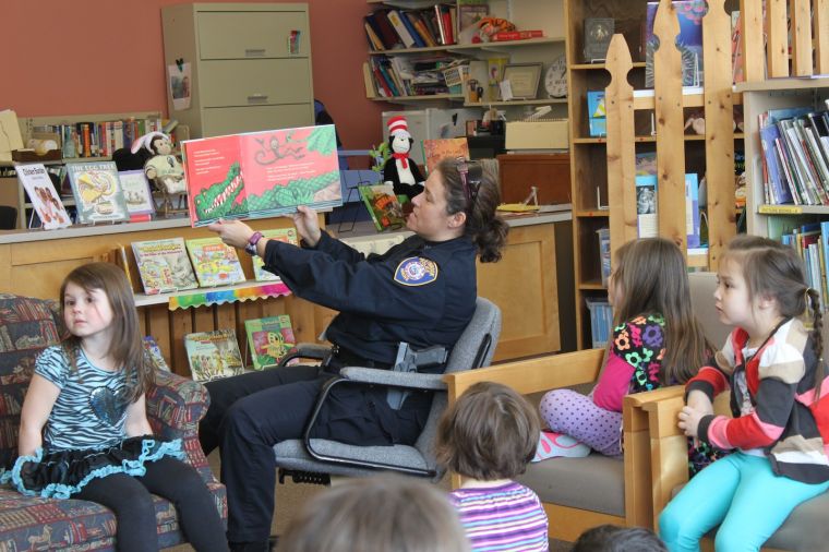 Hayden Walker, Corah Gregory, Isabella Shaw, Giang Wayne and the rest of Melissa Morowski’s kindergarten class at Congin Elementary School listen last week to Westbrook Police Officer Sandy Mailman read “Monkey: A Trickster Tale from India,” written and illustrated by Gerald McDermott. Mailman is one of many people from the city, including Superintendent Marc Gousse, Mayor Colleen Hilton and Police Capt. Tom Roth, who have come in to read to classes as part of the guest reader program. It is part of a month-long celebration to entice and increase reading at the elementary schools. Students also receive paper rings for every book they read during school hours, with a goal of getting enough rings to make a chain around the school by the end of the month. Staff photo by Suzanne Hodgson