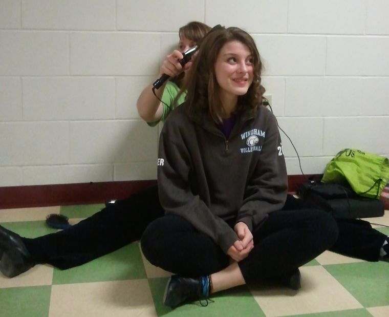 Windham High School student Crystal Frappier, 16, sits patiently while Main Stage Productions Director Suzy Cropper does her hair. Frappier and a group from Main Stage performed a medley from the musical, “Mamma Mia,” at Windham High School’s fundraiser, Dancing with the Staff. The two-night event raises money for Project Graduation. Courtesy photo