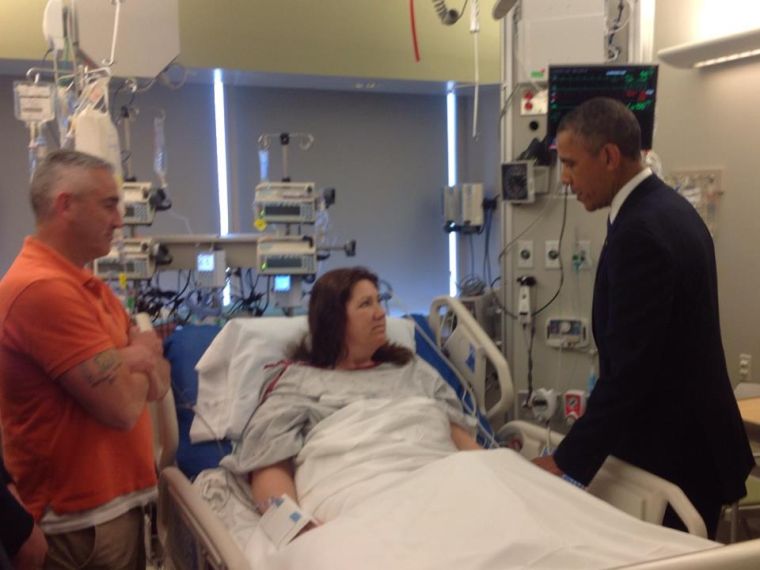 Karen Rand, a former South Portland resident injured in the Boston Marathon bombing last week, is visited at the hospital by President Barack Obama. Courtesy photo