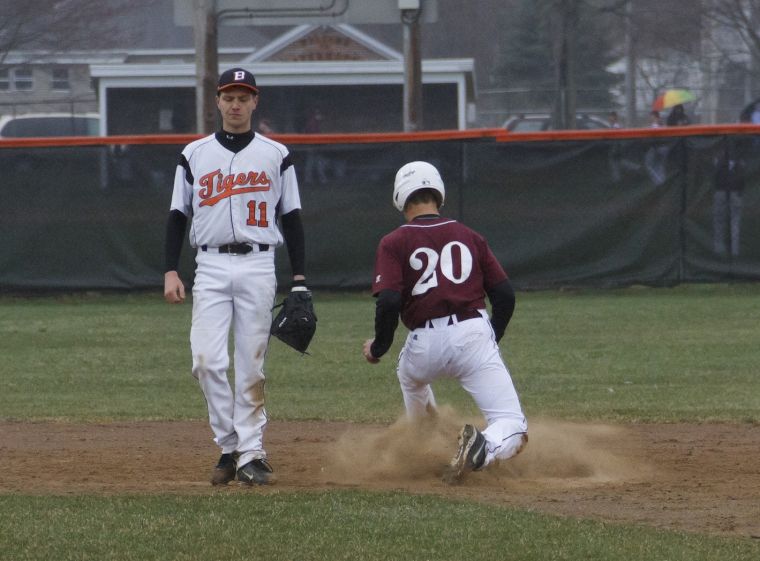 Windham’s Calvin Field steals second. Tiger Patrick Wilson mans the base.
