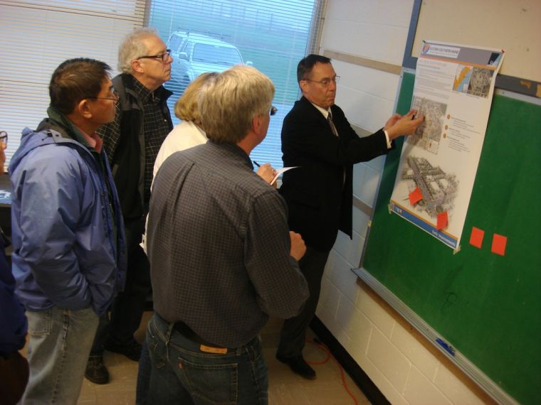 SMRT Architect Mark Johnson points to a detail on one of three possible design plans his firm prepared of South Portland’s Knightville district, during a public visioning session held May 9 at the planning and development office as part of a Sustain Southern Maine pilot study of the area,