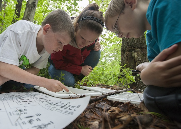Nathaniel Haven, left, and James Berube examine trays of macroinvertabrates with University of Southern Maine student Josie Lahey, looking for species that indicate a healthy habitat for the baby trout.