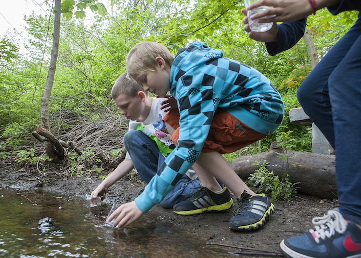 Students from the Dyer Elementary School in South Portland help test the water and stock the trout fry in the aptly-named Trout Brook Nature Preserve on Presumpscot Street.