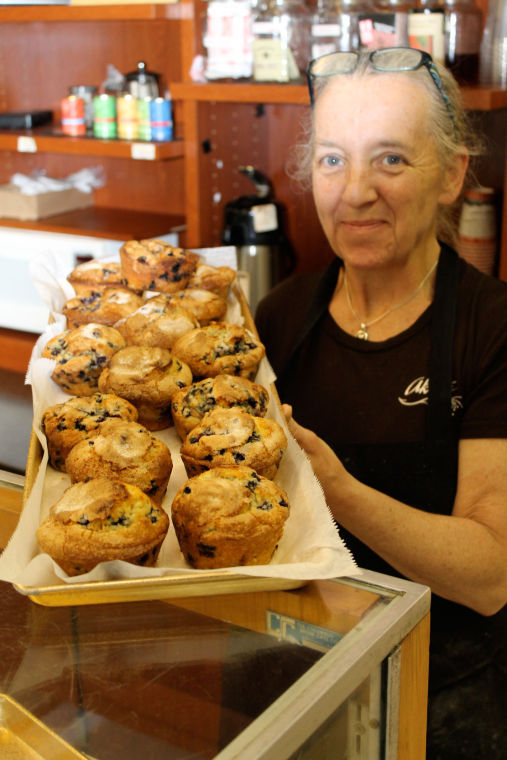 Kate Maynard, owner of Freeport’s Sticky Buns Cafe, holds up a few of her home-baked muffins. She recently purchased the bakery and said her focus will be on locals.