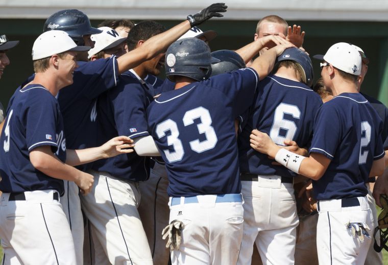 The Blue Blazes heap love on Zach Bean (6) after his grand slam over the left field wall.