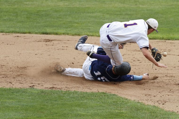 Kyle Heath’s slide into second upends the Marshwood baseman, causing him to drop the ball.