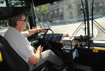 Mike Barnes, an 18-year veteran bus driver for South Portland, takes his charge on a turn through Legion Square Tuesday morning. An interim director takes over the 11-person transportation department July 1, while the city eyes a potential merger of its bus services with Portland Metro and the Biddeford/Saco Shuttlebus.