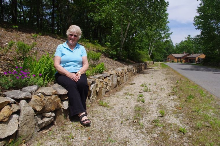 Anita Holmquist sits on one of the many stone walls she has built on her Raymond property. The walls, and the terraced gardens they retain, will be on display during Saturday’s Raymond Garden Tour sponsored by the Raymond Village Library.
