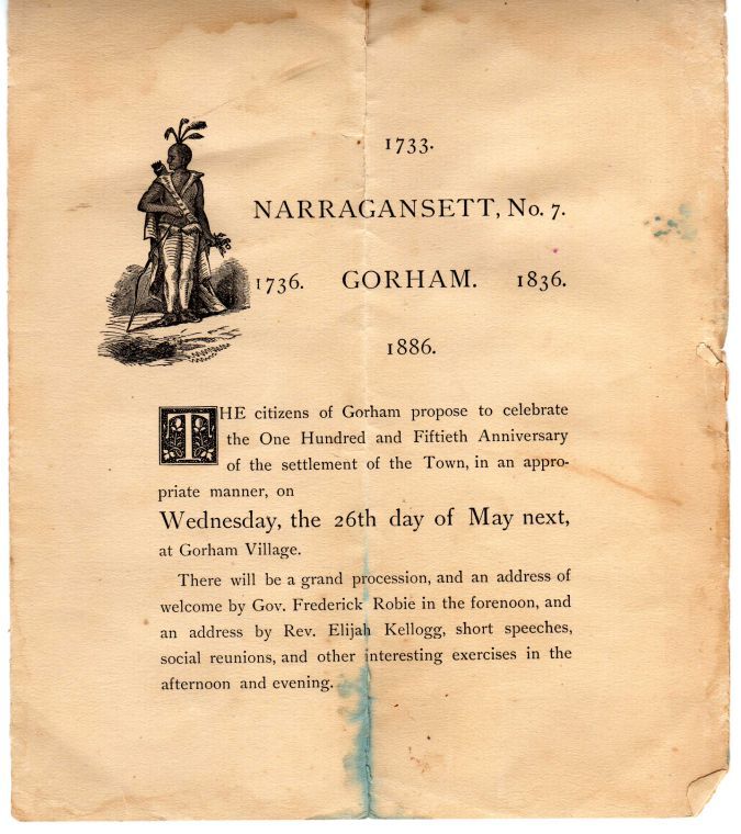 This 1886 flyer announces Gorham’s 150th anniversary celebration and Mark Mosher, ancestor of today’s Mosher family in Gorham, served on the committee. The town’s first settlers arrived in 1736 and Gorham Founders Festival this weekend pays homage.